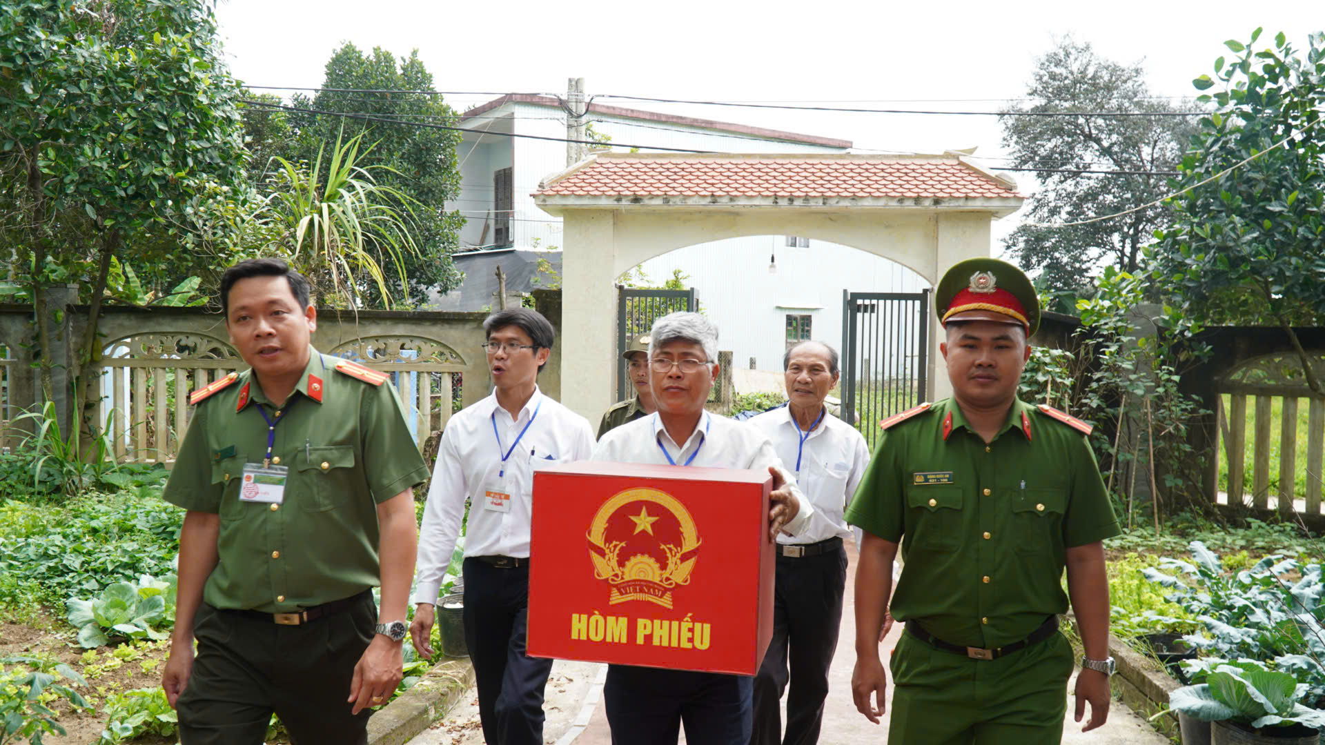 Đi cùng đoàn còn có lực lượng Công an xã nhằm bảo đảm an ninh, an toàn trong suốt quá trình di chuyển và tổ chức cho cử tri cao tuổi bỏ phiếu.