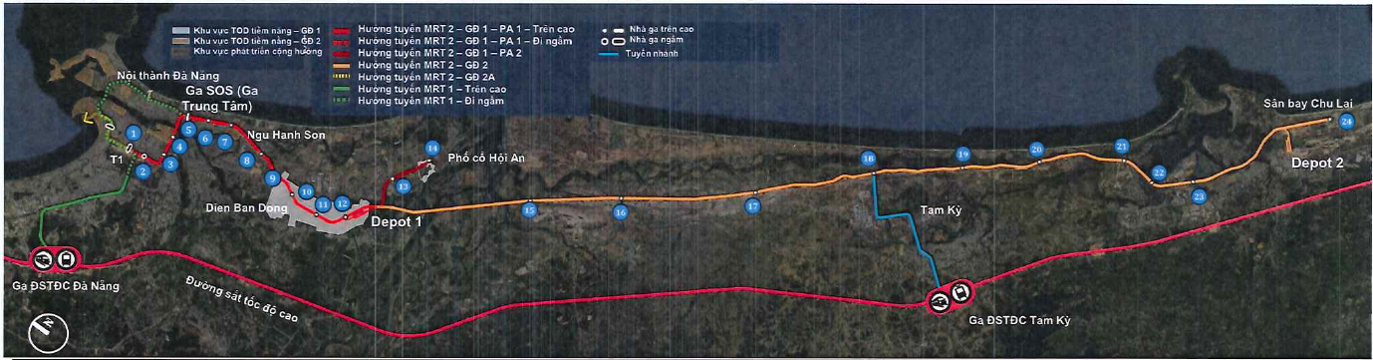 Tuyến kết nối Ga đường sắt tốc độ cao với Ga Đà Nẵng theo hình thức LRT, có chiều dài 12,3 km; tuyến Hội An – Sân bay Chu Lai theo hình thức MRT, có chiều dài khoảng 70 km, cùng các tuyến khác theo đề xuất của nhà đầu tư, nhằm từng bước hình thành mạng lưới giao thông công cộng khối lượng lớn, kết nối liên hoàn giữa đô thị trung tâm, đô thị vệ tinh và khu vực phía Nam.