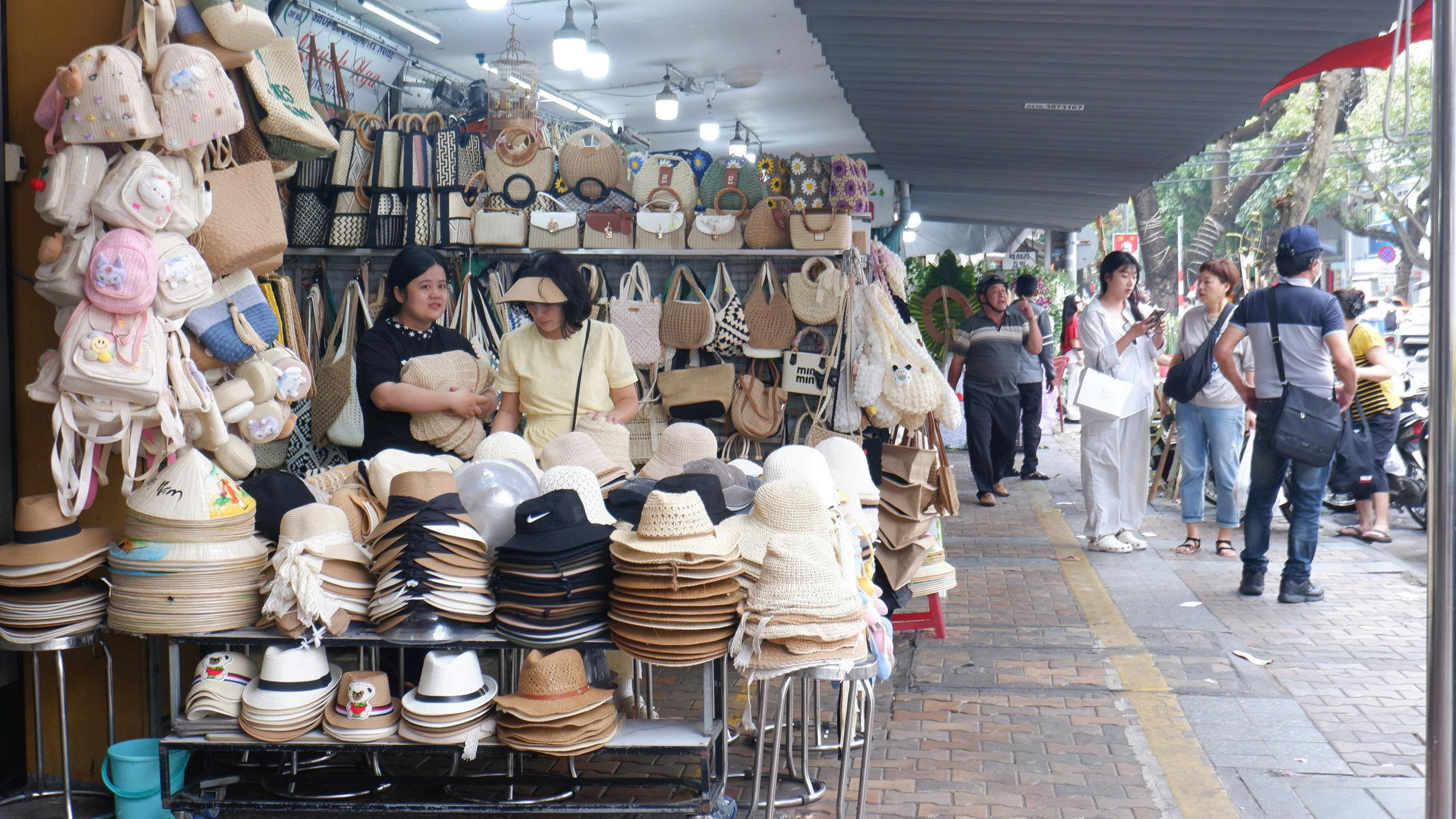 Các gian hàng nón, túi thủ công phục vụ du khách quốc tế dịp Tết