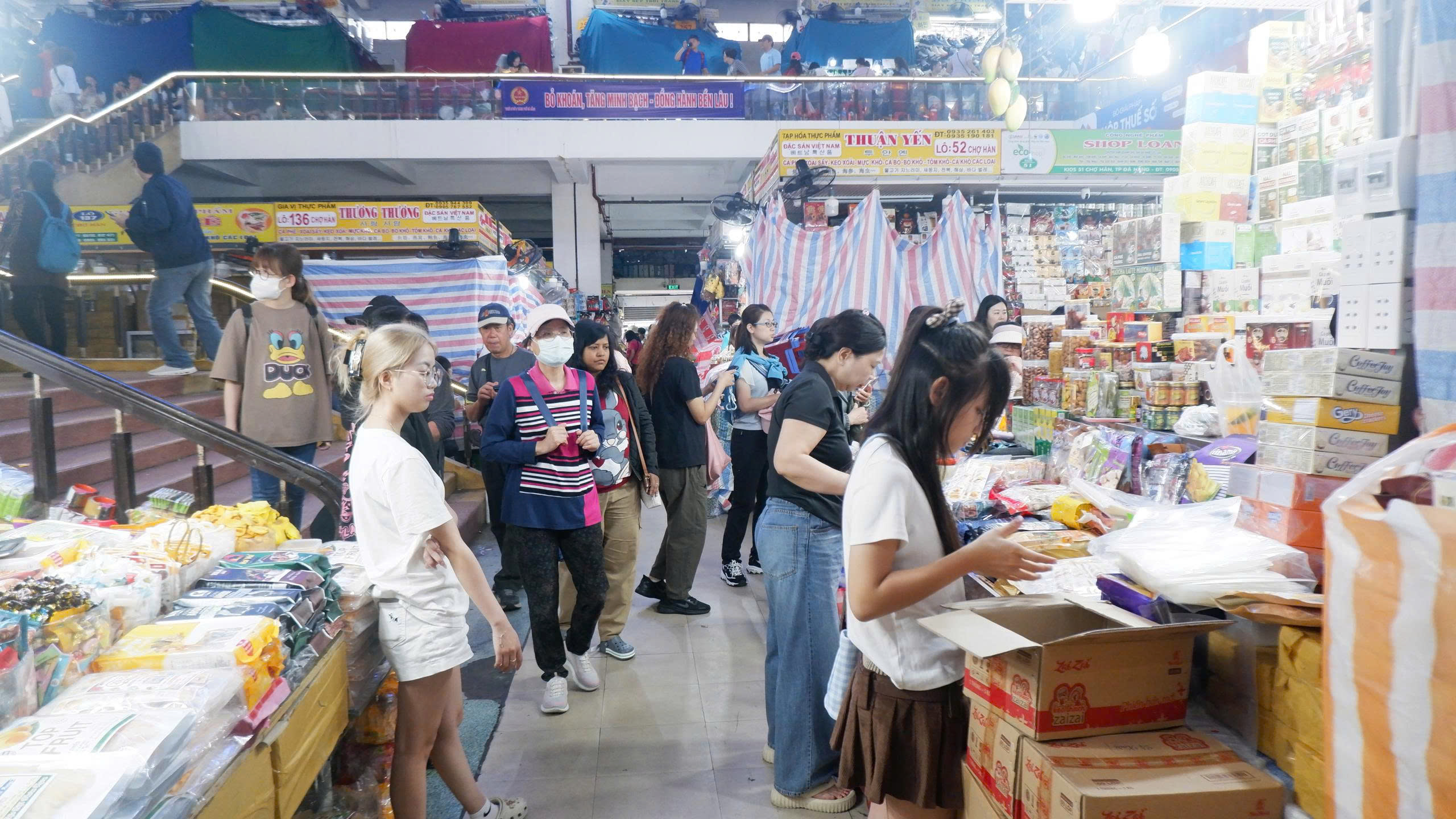 Du khách tìm hiểu, chọn mua cà phê, bánh kẹo và đặc sản khô tại khu vực tầng trệt Chợ Hàn