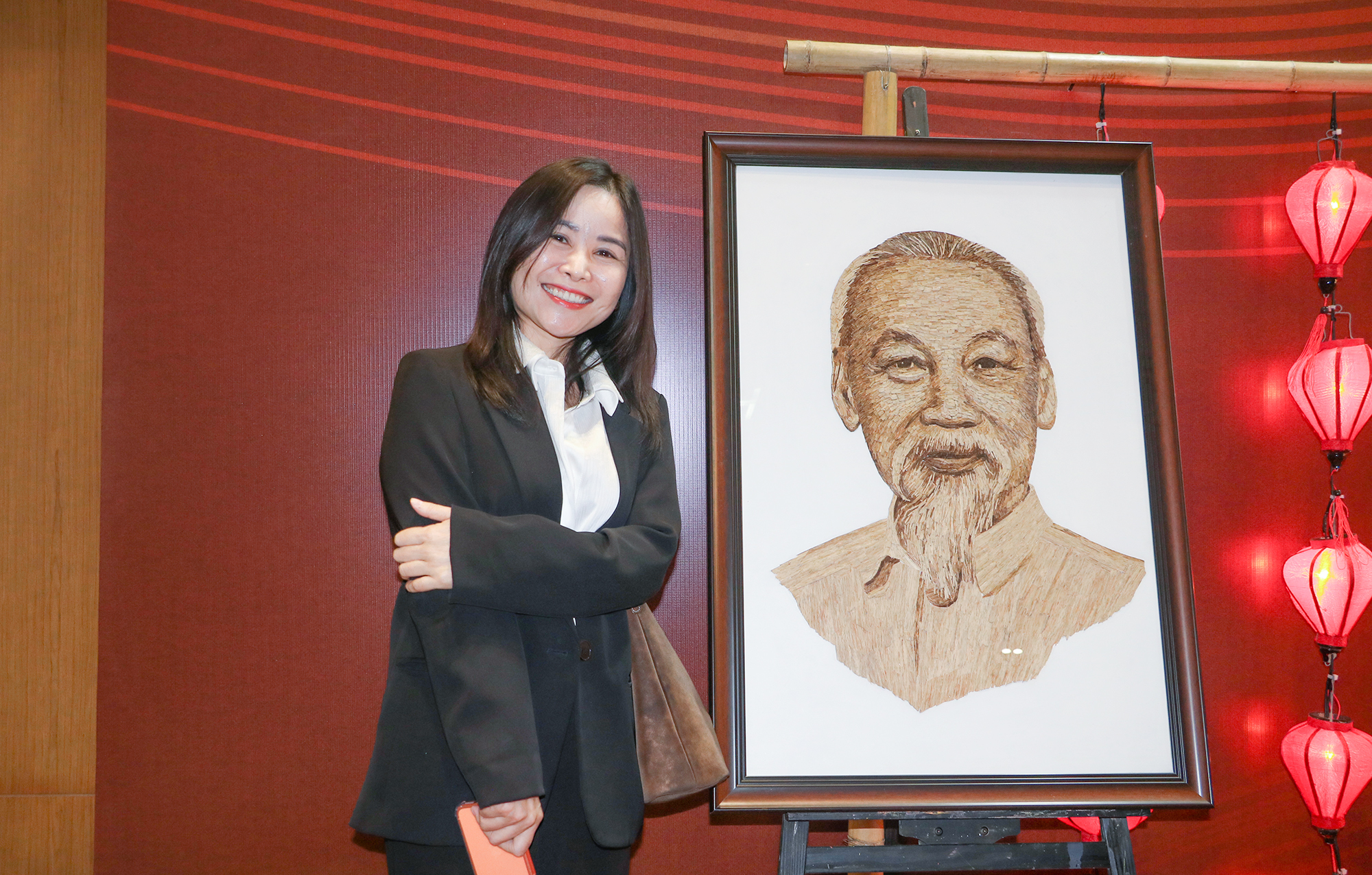 Đại biểu chụp ảnh lưu niệm bên tác phẩm chân dung Chủ tịch Hồ Chí Minh được trưng bày tại không gian văn hóa truyền thống