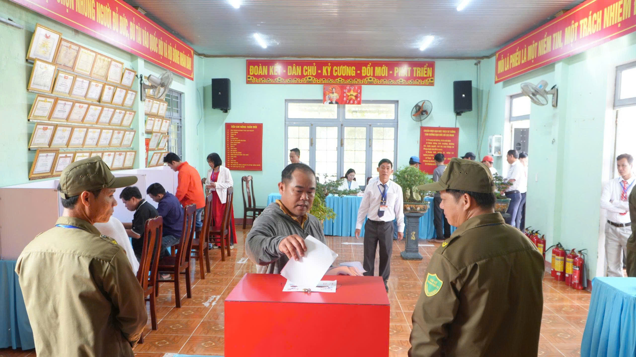 Cử tri các thôn đã có mặt từ sớm, thực hiện các bước kiểm tra thẻ cử tri, nhận phiếu bầu và tự tay bỏ lá phiếu của mình vào thùng phiếu theo đúng quy định. Lực lượng tổ bầu cử hướng dẫn tận tình, đảm bảo quá trình bỏ phiếu diễn ra dân chủ, đúng pháp luật.