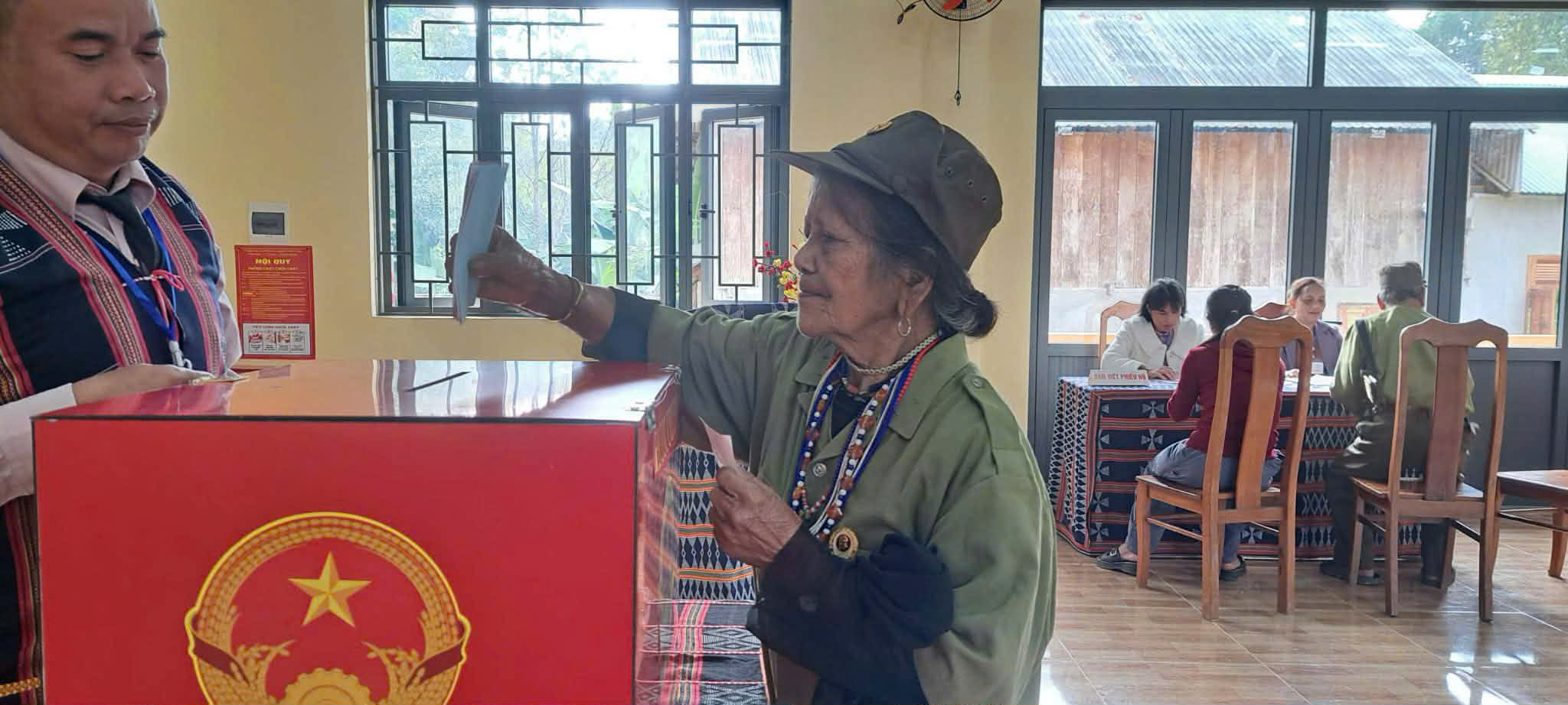 Cử tri có mặt tại các điểm bỏ phiếu trong không khí vui tươi nhưng nghiêm túc. Bà con đến theo từng nhóm nhỏ; có người đi bộ từ các nóc làng xa, có người tranh thủ đi bỏ phiếu sớm trước khi lên rẫy. Các thành viên tổ bầu cử cũng có mặt từ sớm để kiểm tra danh sách, phát phiếu và hướng dẫn cử tri thực hiện đúng quy trình bỏ phiếu.