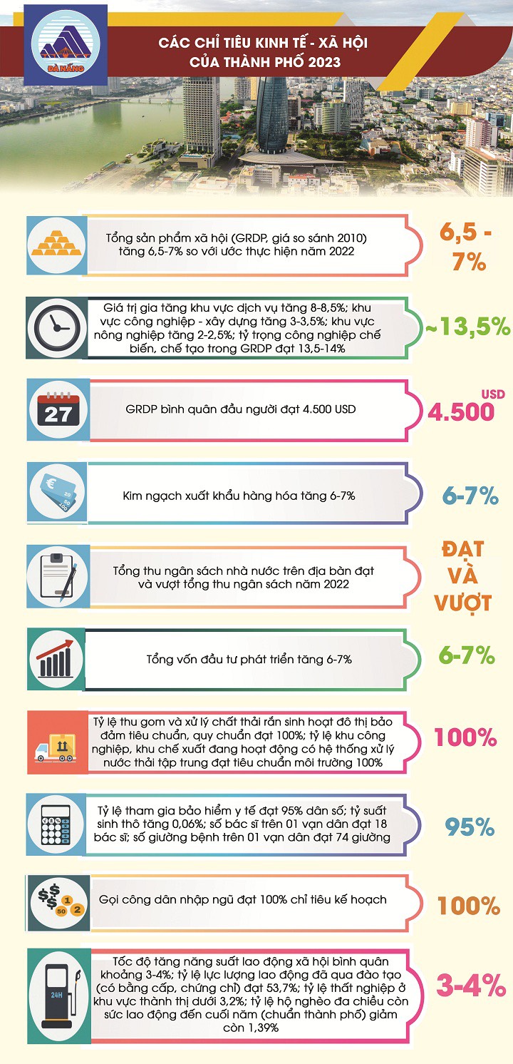 Với chủ đề năm 2023 là “Năm tập trung khơi thông các nguồn lực, thu hút đầu tư, giữ vững tăng trưởng kinh tế và đảm bảo an sinh xã hội”, thành phố Đà Nẵng đề ra 10 chỉ tiêu phát triển kinh tế - xã hội để thực hiện tốt chủ đề năm, giữ vững tăng trưởng cho thành phố, trong đó, đề ra chỉ tiêu tổng sản phẩm xã hội (GRDP, giá so sánh 2010) tăng 6,5-7% so với ước thực hiện năm 2022. Cụ thể như sau: