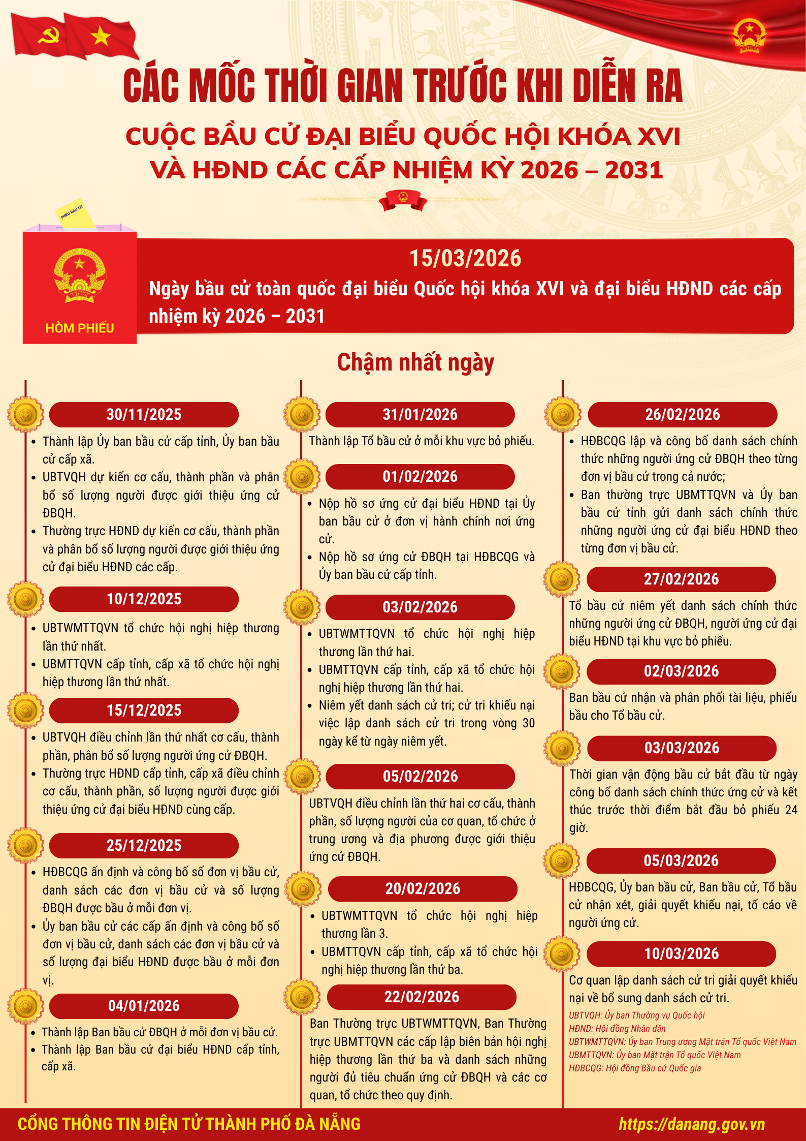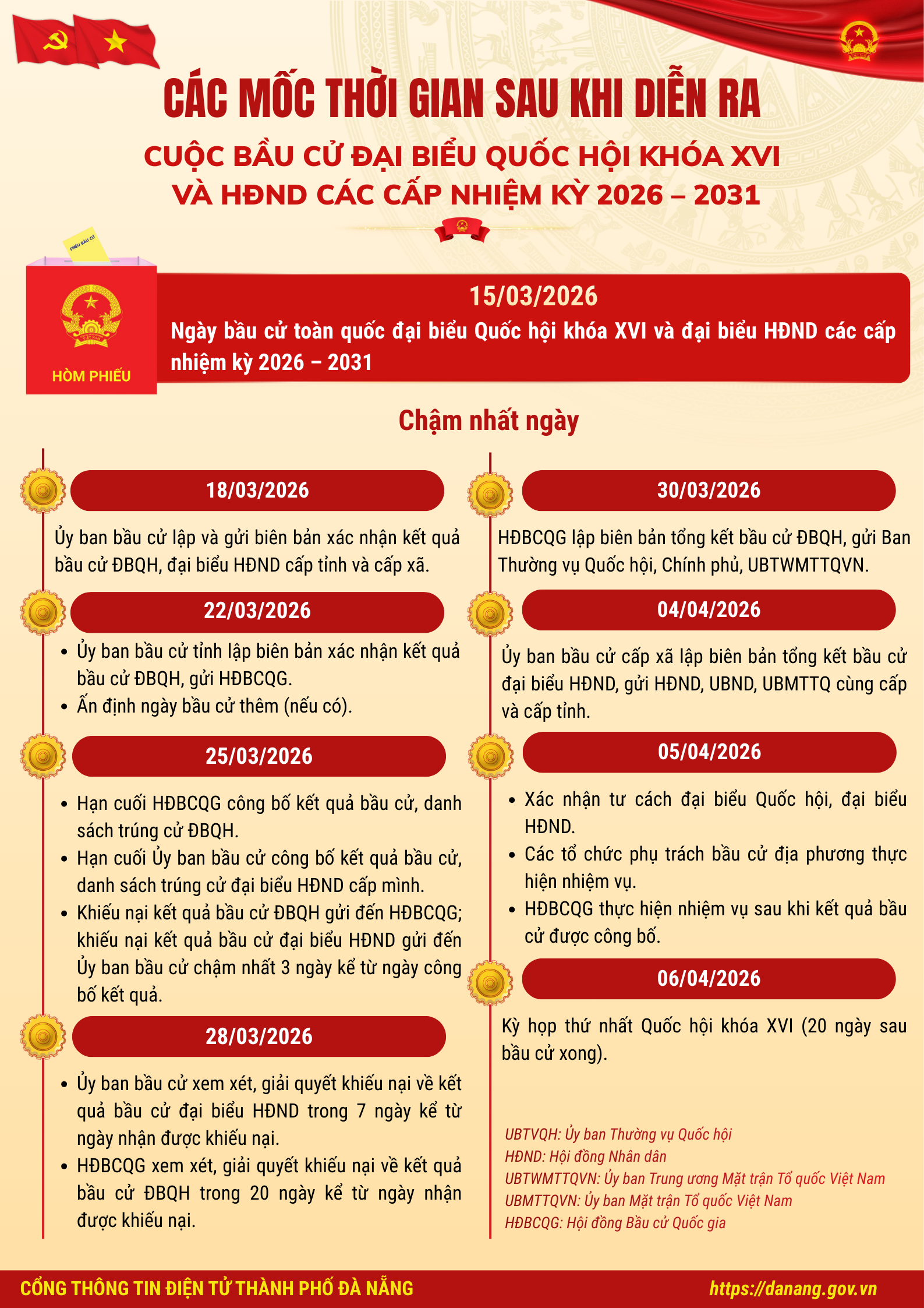 [Infographic] - Các mốc thời gian trước và sau khi diễn ra cuộc bầu cử đại biểu Quốc hội khóa XVI và HĐND các cấp nhiệm kỳ 2026 - 2031