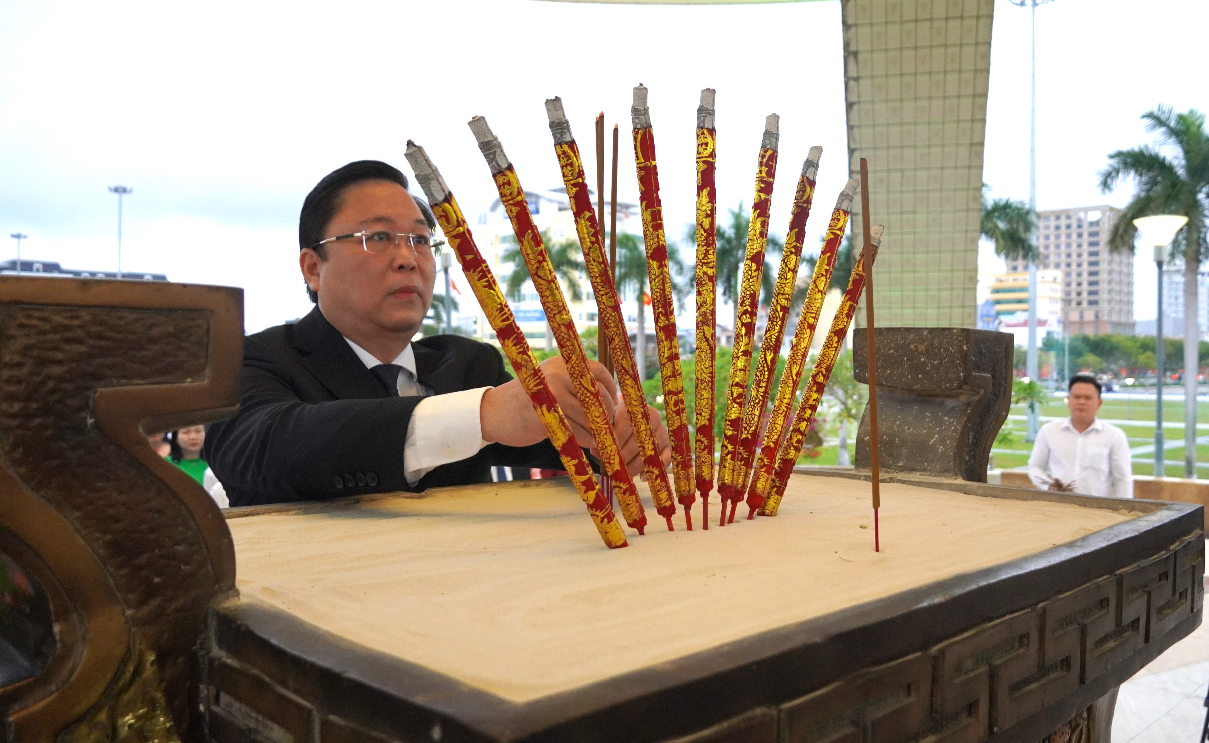Chủ tịch Ủy ban MTTQ Việt Nam thành phố Lê Trí Thanh dâng hoa, dâng hương tưởng niệm các Anh hùng liệt sĩ tại Đài Tưởng niệm thành phố.