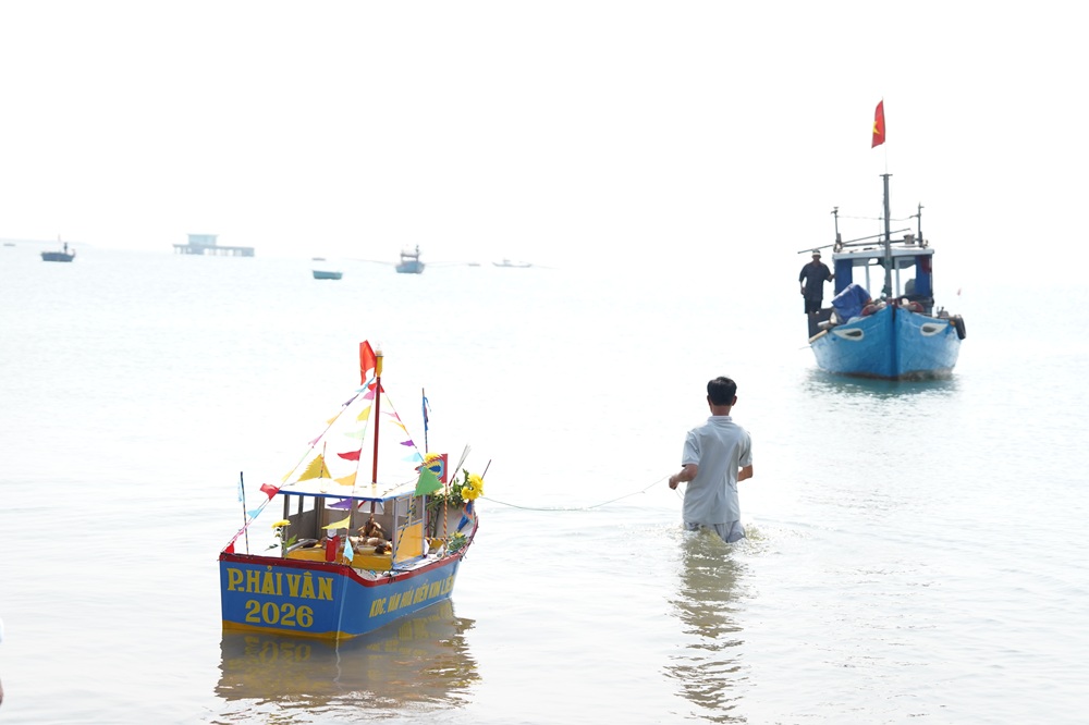 Điểm nhấn đặc biệt của phần lễ là nghi thức rước thuyền ra biển. Chiếc thuyền lễ được trang trí rực rỡ cờ hoa, mang theo lễ vật và linh vị tượng trưng, được rước từ Lăng Ông ra bãi biển trong tiếng trống rộn ràng. Đoàn rước nối dài với sự tham gia của đông đảo lãnh đạo, ngư dân và người dân địa phương, tạo nên một không gian vừa trang nghiêm vừa sống động.