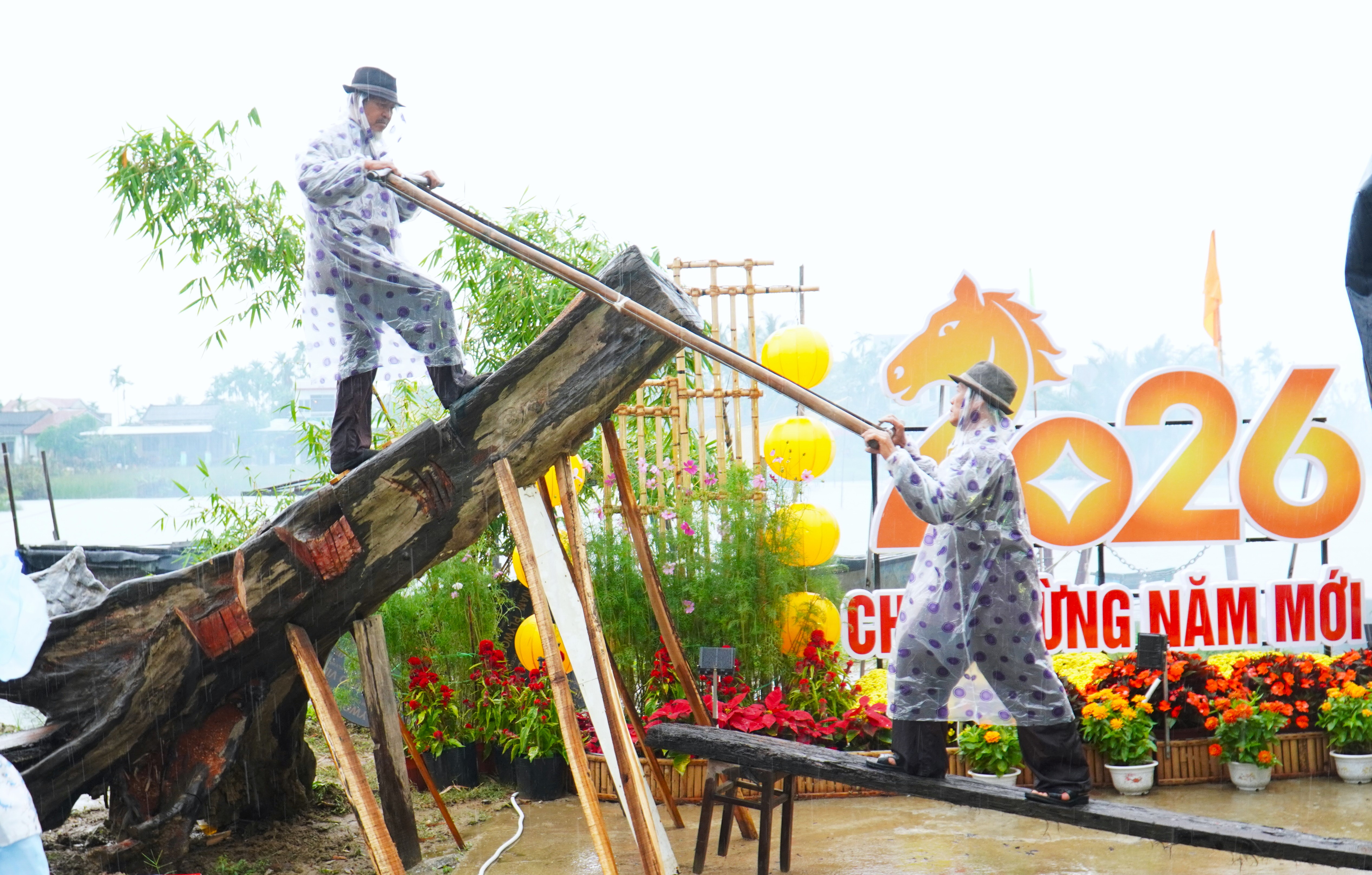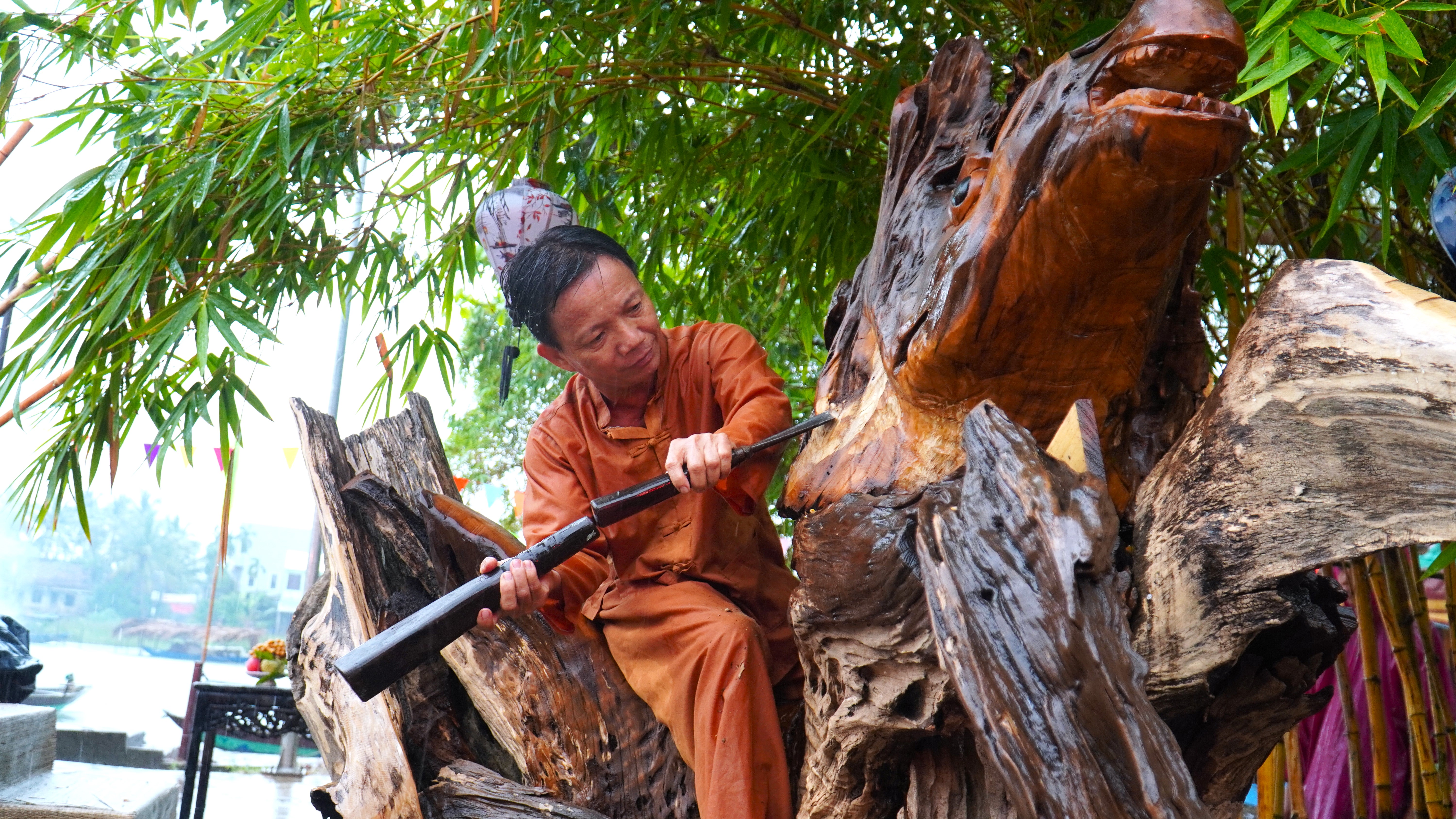 Nghệ nhân làng mộc Kim Bồng trình diễn kỹ thuật chế tác gỗ, phục vụ người dân và du khách tham quan.