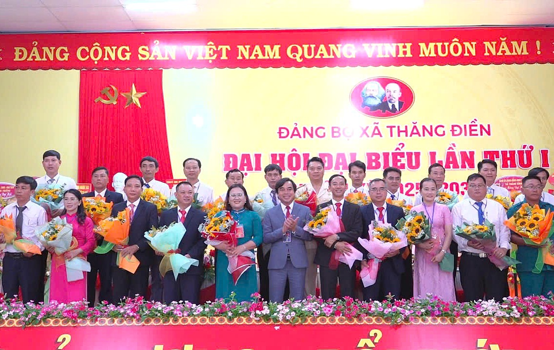 Chị Nguyễn Thị Tuyết Thanh (áo dài xanh hàng đầu), ra mắt nhận nhiệm vụ Bí thư xã Thăng Điền cùng Ban Chấp hành Đảng bộ xã tại đại hội lần thứ I, nhiệm kỳ 2025-2030. Ảnh: NGUYỄN BÌNH.