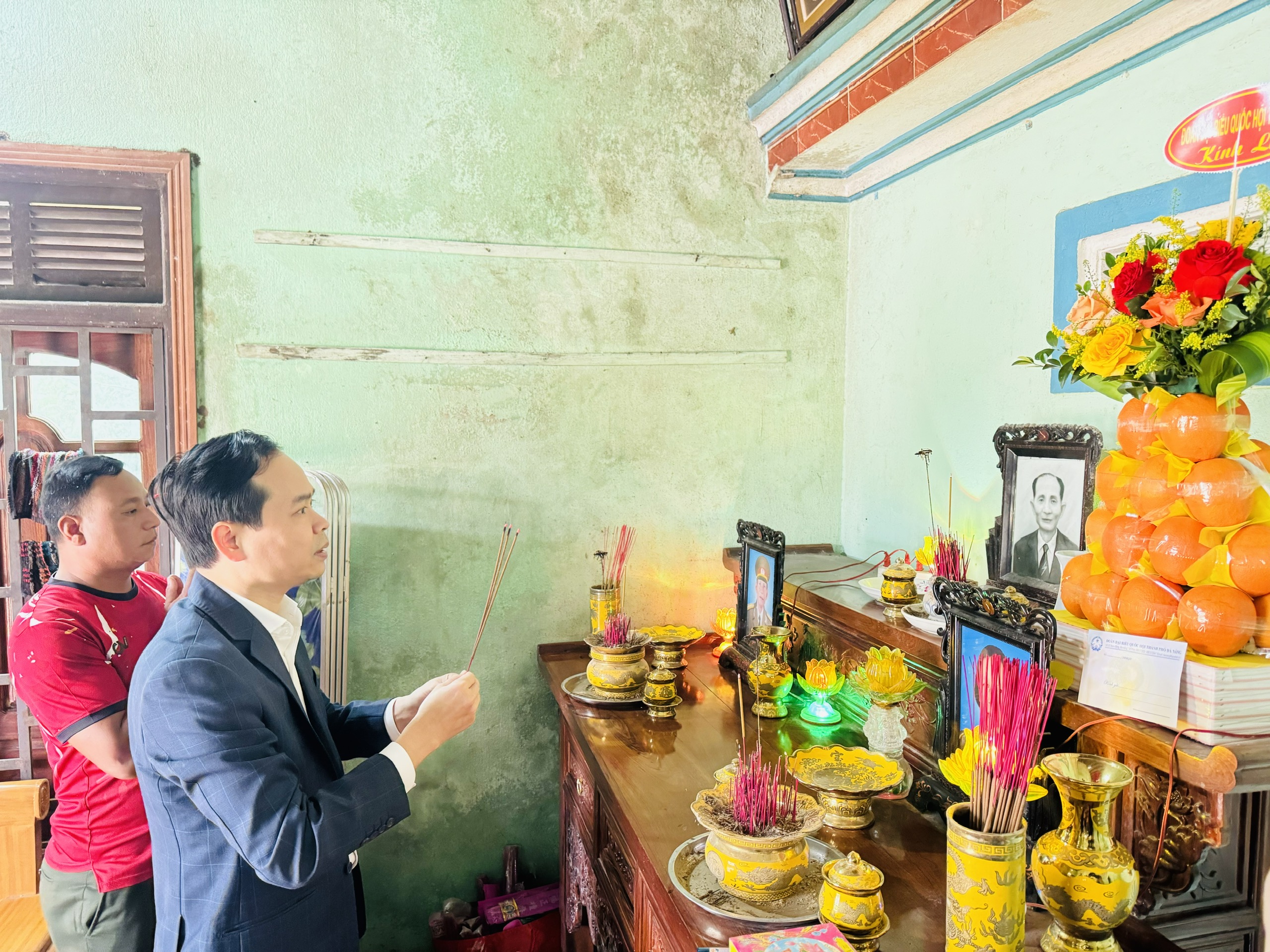 Ông Nguyễn Duy Minh - Phó Trưởng đoàn chuyên trách ĐBQH Thành phố viếng hương liệt sĩ Đinh Tựu - nguyên Đại biểu Quốc hội Khóa I tại xã Trà Liên. Ảnh: Tuấn Tú