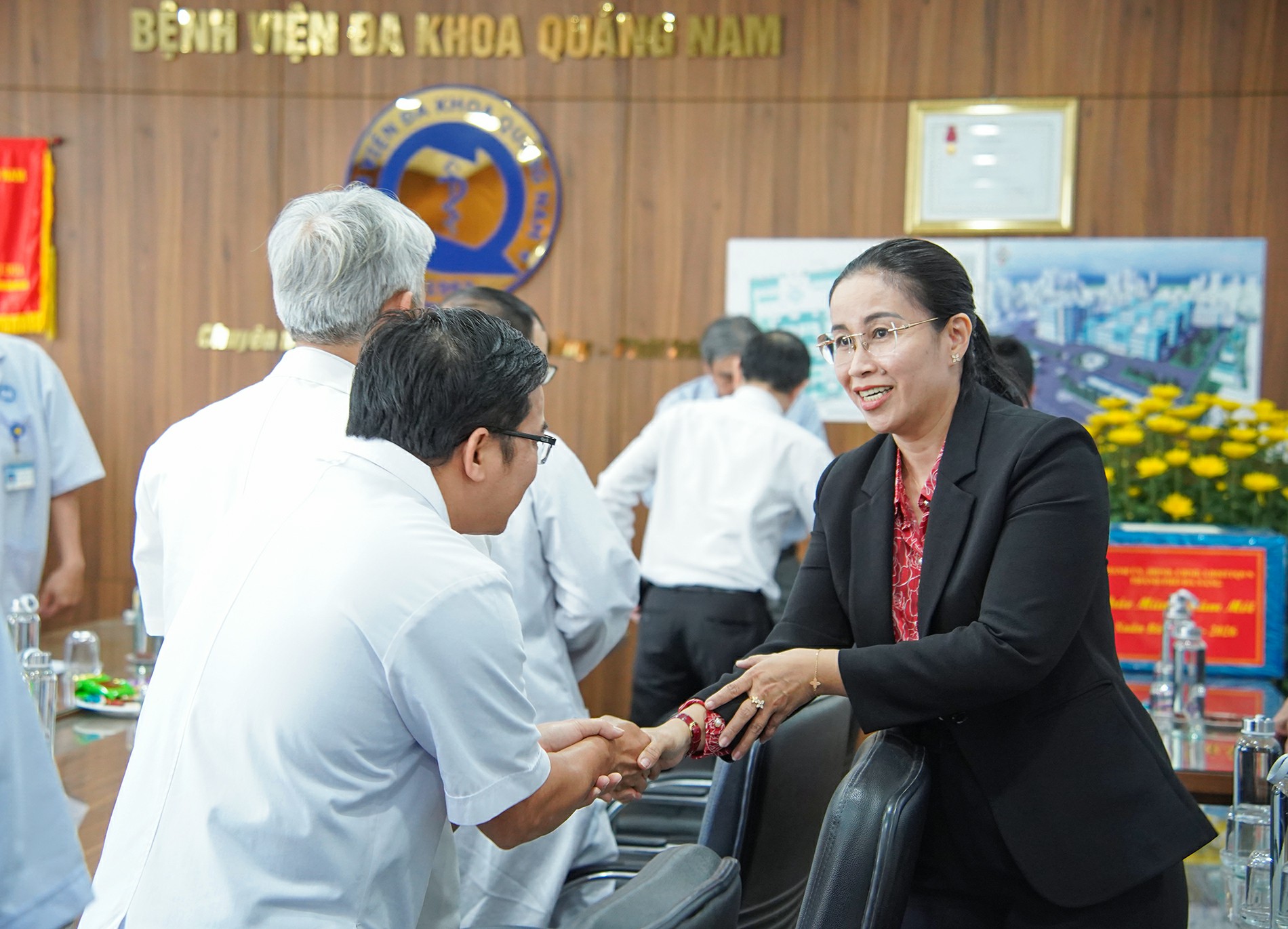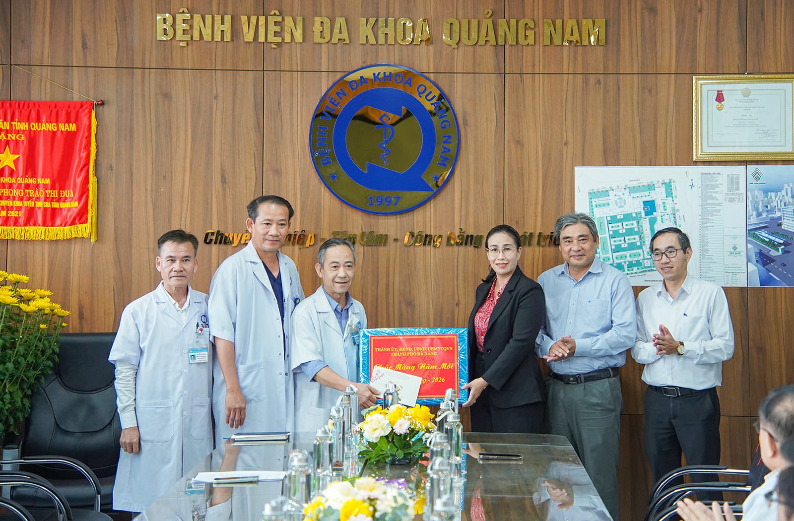 Tại Bệnh viện Đa khoa Quảng Nam, Phó Chủ tịch UBND thành phố Nguyễn Thị Anh Thi gửi lời chúc mừng năm mới sức khỏe, an khang, thịnh vượng đến tập thể Ban Giám đốc cùng toàn thể y, bác sĩ, viên chức và người lao động của bệnh viện.