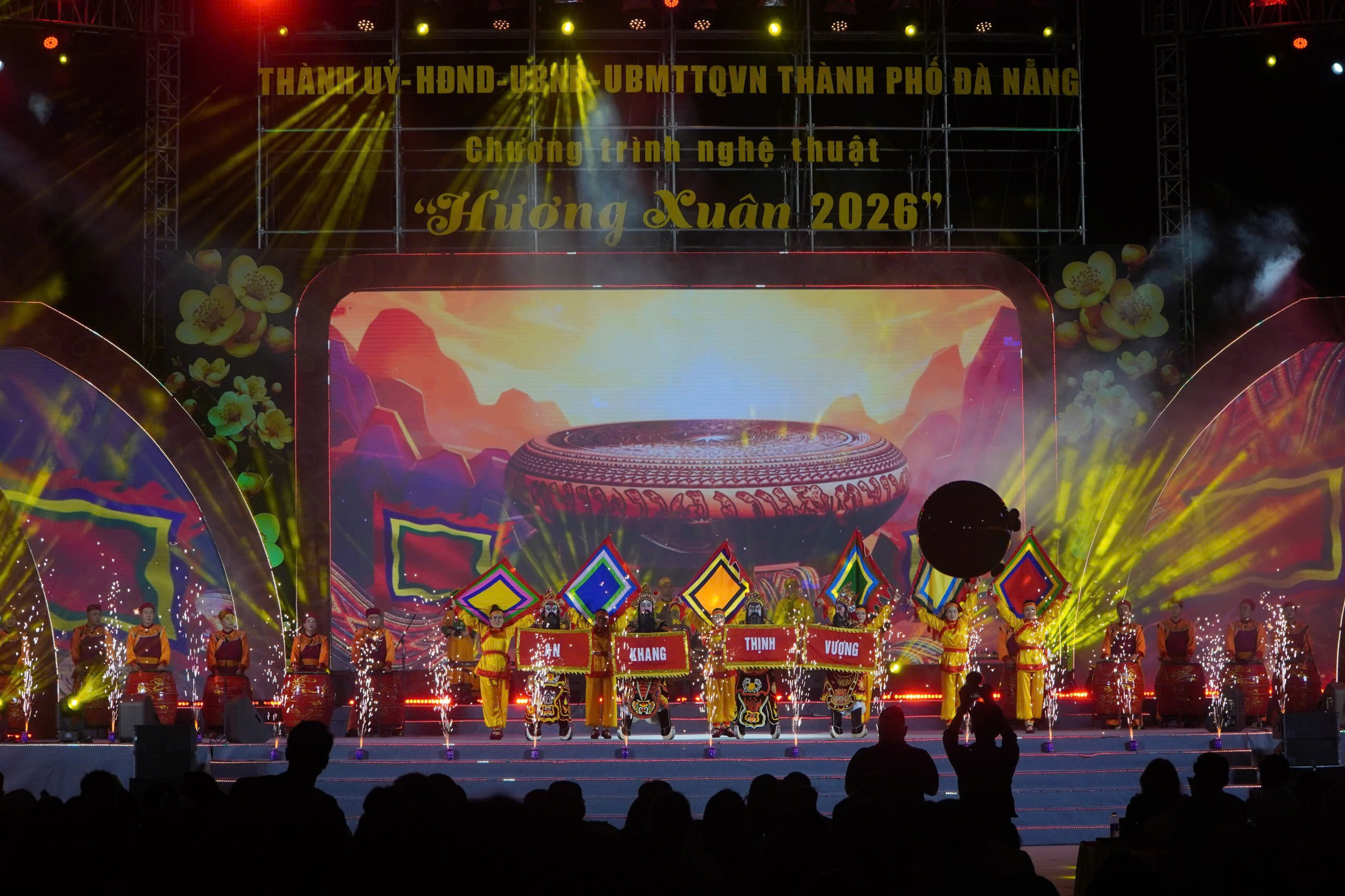 Sân khấu được dàn dựng công phu, rực rỡ ánh đèn, mang đến những tiết mục ca múa nhạc phong phú, đậm sắc xuân, ca ngợi quê hương, đất nước và khát vọng năm mới an khang, thịnh vượng. Tiếng hát, điệu múa hòa cùng những tràng pháo tay cổ vũ khiến không gian như nóng lên giữa tiết trời đêm se lạnh.