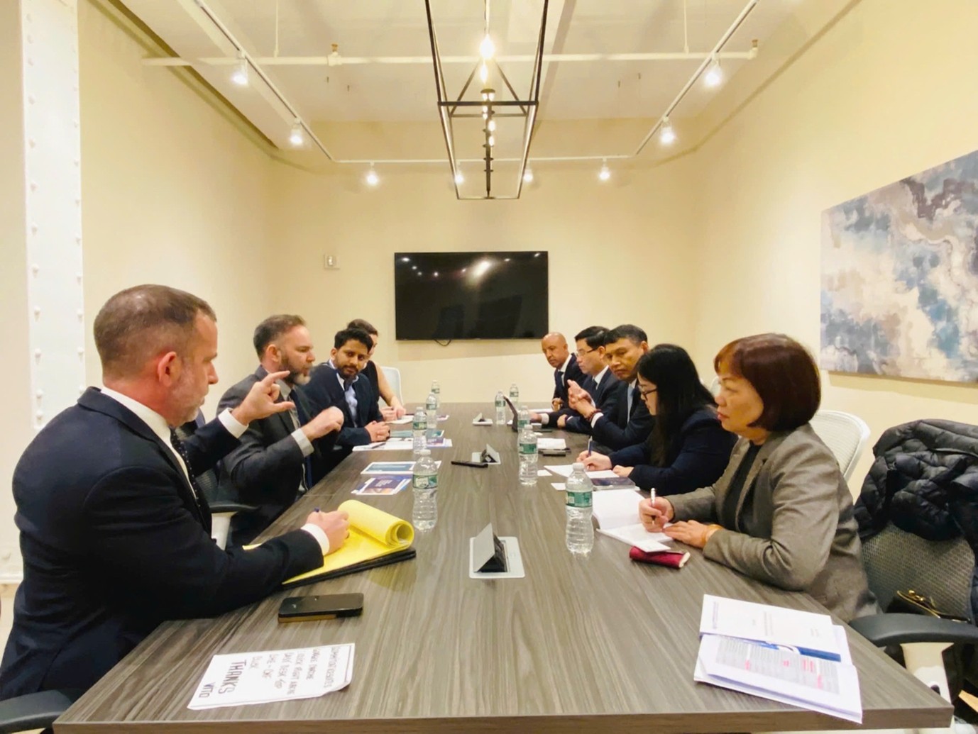 Sáng 23-3, tại trụ sở tập đoàn Warburg Pincus (New York) - nhà đầu tư tư nhân lớn nhất tại Việt Nam với danh mục hơn 2 tỷ USD, Đoàn công tác tham dự và phát biểu tại Toạ đàm “Trung tâm tài chính Việt Nam: Tầm nhìn và Cơ hội” với sự góp mặt của hơn 70 đại biểu gồm các định chế tài chính hang đầu thế giới như BlackRock, Deutsche Bank…