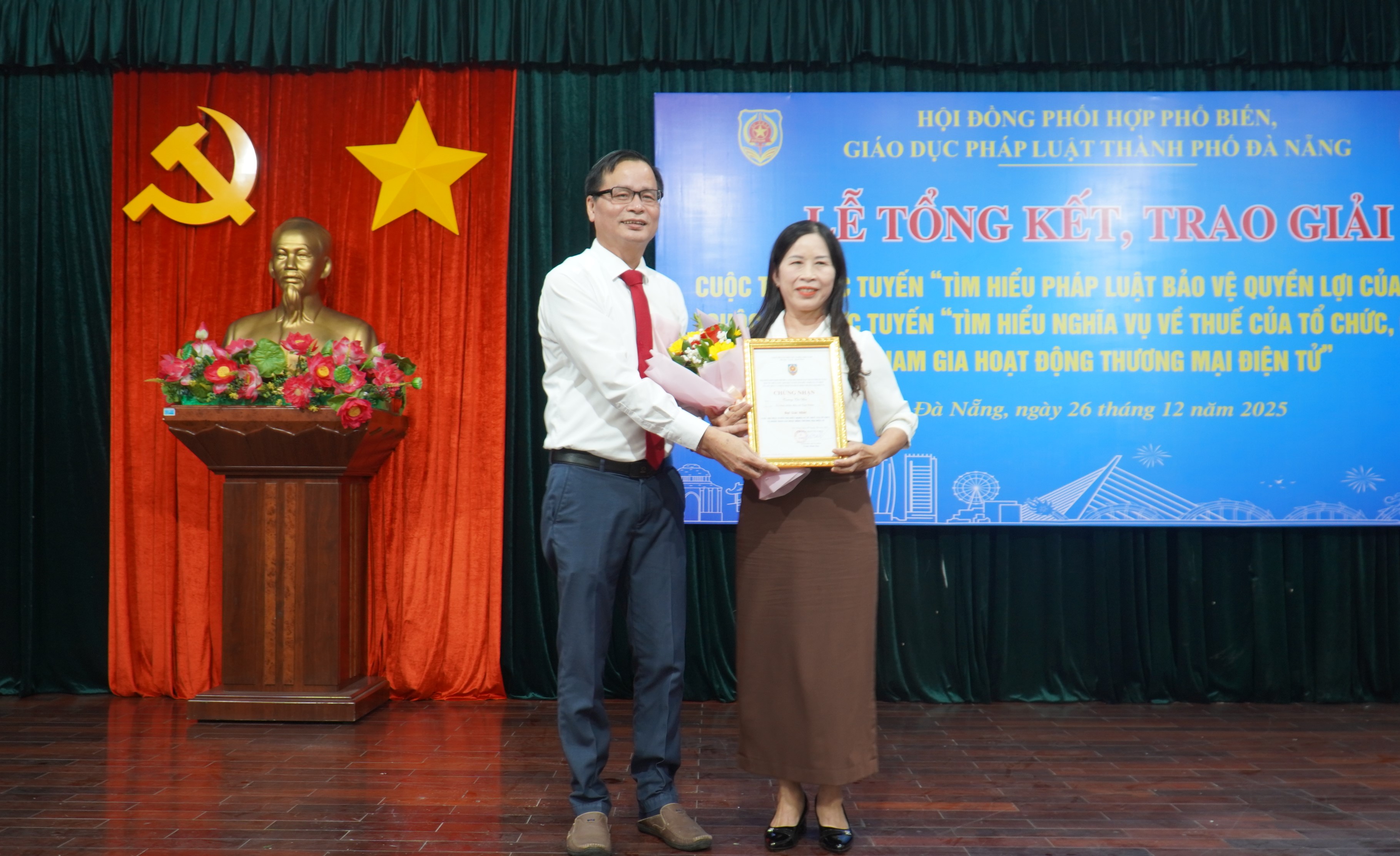 Chiều 26-12, Hội đồng Phối hợp phổ biến, giáo dục pháp luật thành phố Đà Nẵng tổ chức lễ tổng kết, trao giải Cuộc thi trực tuyến “Tìm hiểu pháp luật bảo vệ quyền lợi của trẻ em năm 2025” và Cuộc thi “Tìm hiểu nghĩa vụ về thuế của tổ chức, cá nhân tham gia hoạt động thương mại điện tử”.