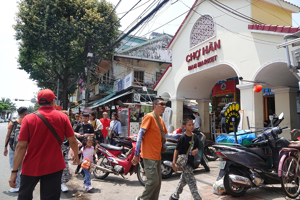 Khu vực trước cổng chợ Hàn (phường Hải Châu) đông đúc du khách, nhưng vỉa hè bị chiếm dụng khiến nhiều người phải di chuyển dưới lòng đường