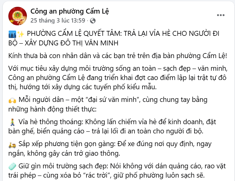 Fanpage Công an phường Cẩm Lệ tích cực chia sẻ, lan tỏa thông tin kêu gọi mỗi người dân hãy là một “đại sứ văn minh”, cùng chung tay bằng những hành động thiết thực: không lấn chiếm vỉa hè để kinh doanh, đặt bàn ghế, biển quảng cáo, trả lại lối đi an toàn cho người đi bộ; sắp xếp phương tiện gọn gàng, giữ gìn môi trường sạch đẹp và kinh doanh văn minh...
