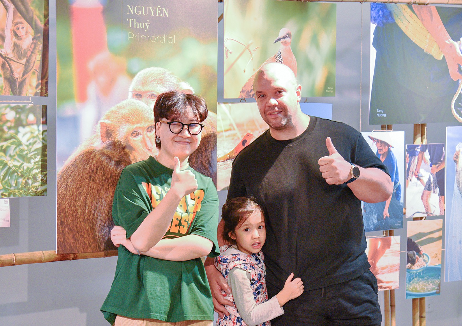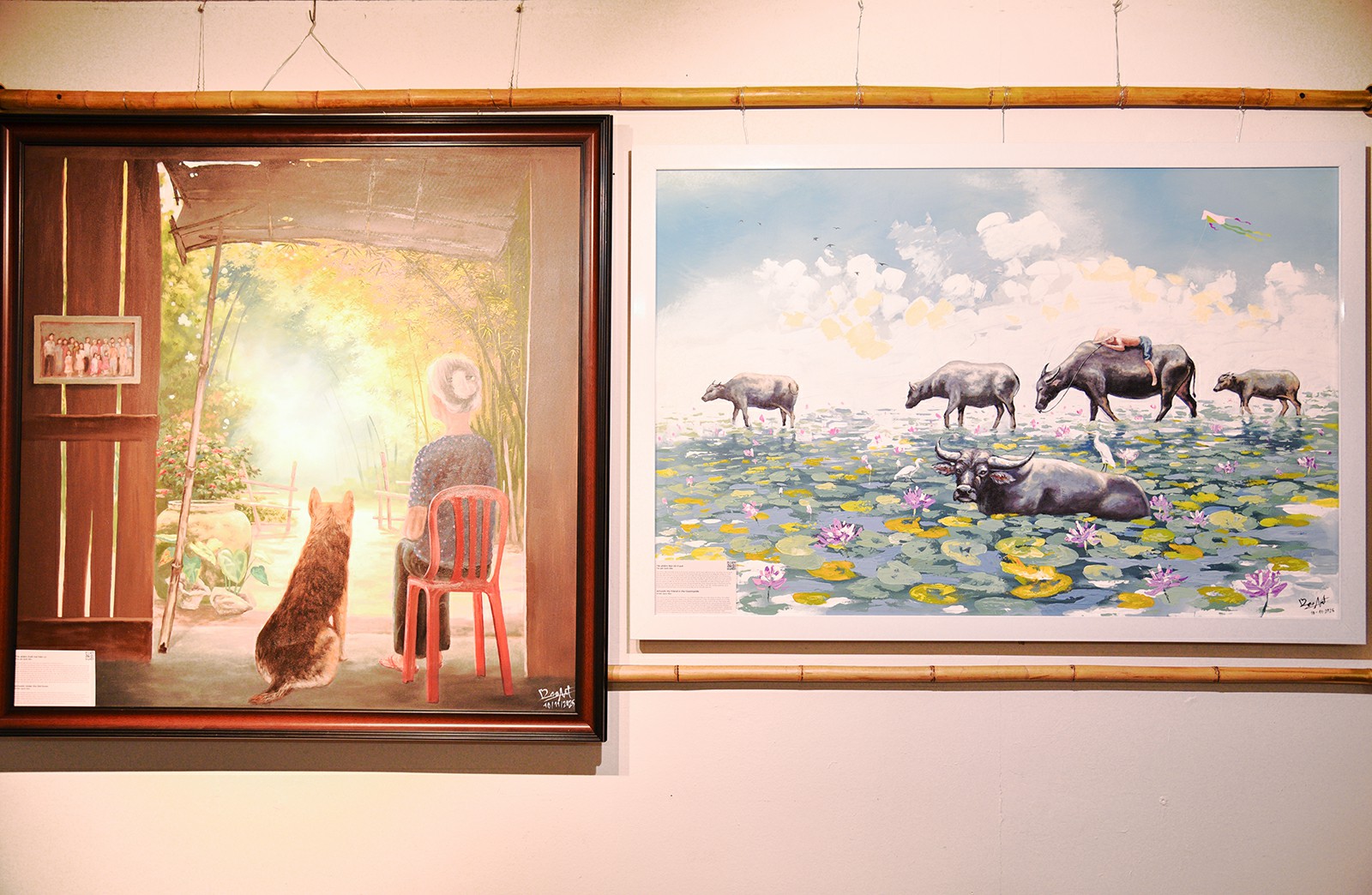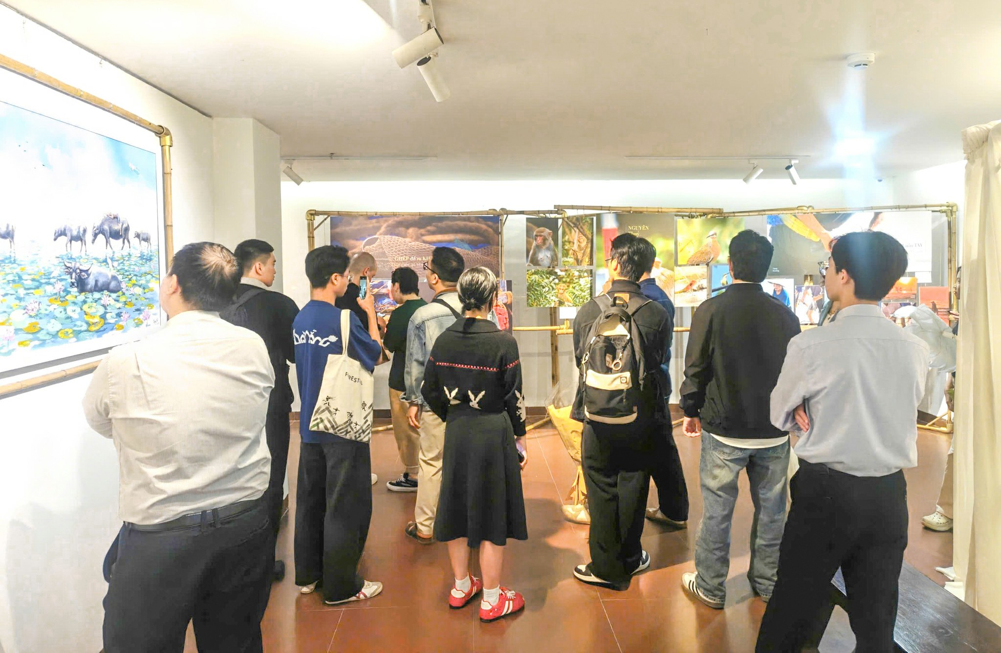 Điểm nhấn nổi bật của triển lãm là không gian sắp đặt sử dụng tre làm vật liệu chủ đạo. Tre được dùng để tạo giá treo và kết nối các mảng nội dung trưng bày, mang lại tổng thể đồng bộ, mộc mạc và thân thiện. Việc lựa chọn tre không chỉ mang ý nghĩa thẩm mỹ mà còn thể hiện tinh thần tôn trọng thiên nhiên, hướng đến sự hài hòa và bền vững trong nghệ thuật cộng đồng.