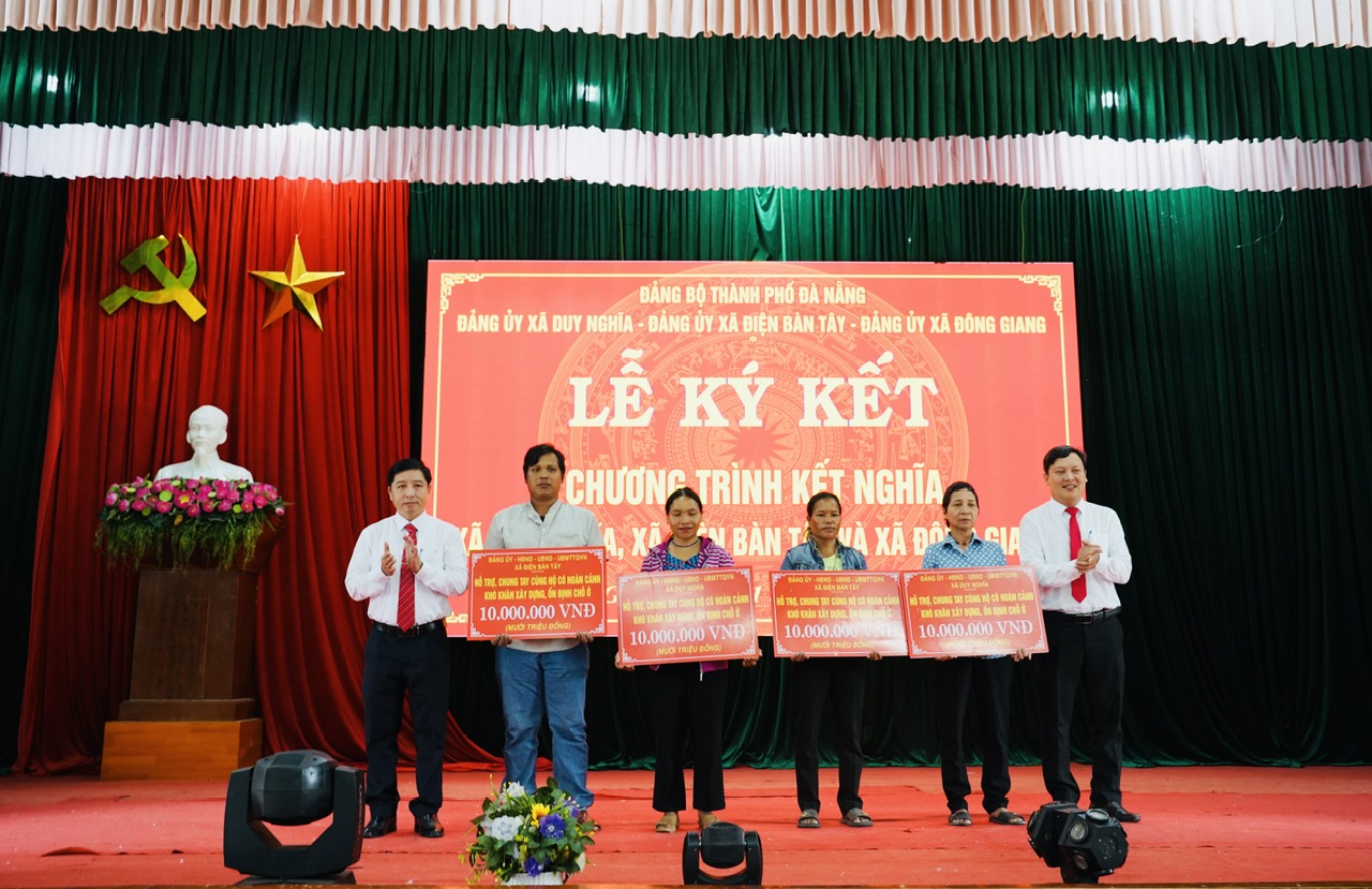 Dịp này, hai xã Điện Bàn Tây và Duy Nghĩa trao tặng 40 triệu đồng cho 4 hộ gia đình có hoàn cảnh khó khăn của xã Đông Giang xóa nhà tạm, ổn định chỗ ở. Xã Duy Nghĩa tặng bà con nghèo của xã Đông Giang 500 mũ bảo hiểm để đảm bảo an toàn tham gia giao thông.