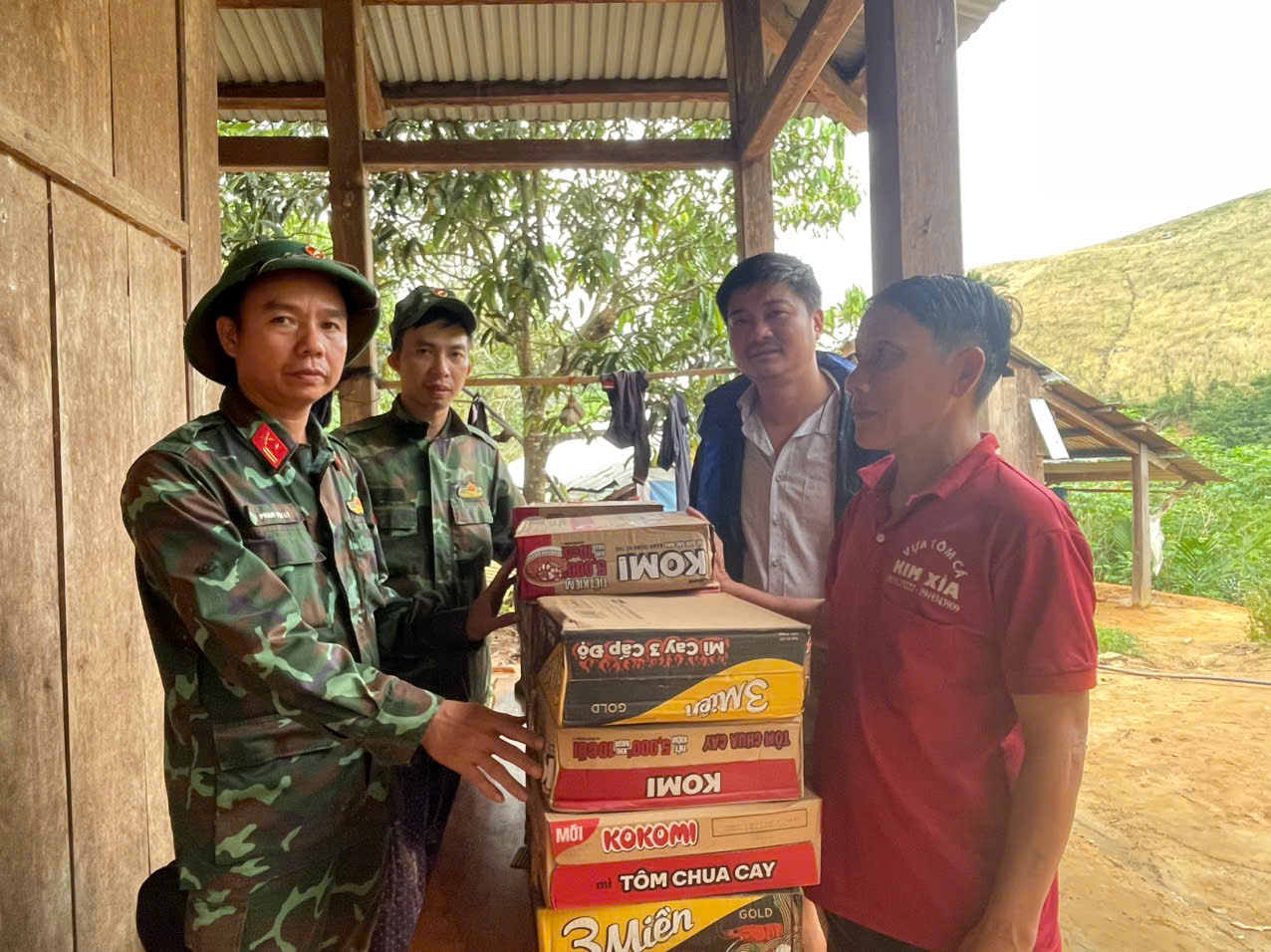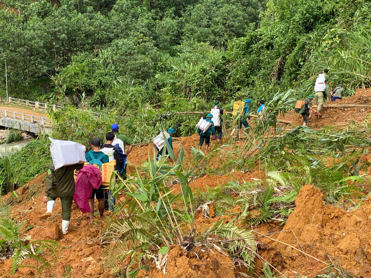 Ngay trong sáng 30-10, xã đã thành lập các tổ công tác đi bộ vào nhiều làng ở sâu trong núi và cõng theo nhu yếu phẩm như mì tôm, lương khô, dầu ăn, muối, mì chính để tiếp ứng cho bà con đang bị cô lập do sạt lở giao thông rất nghiêm trọng.