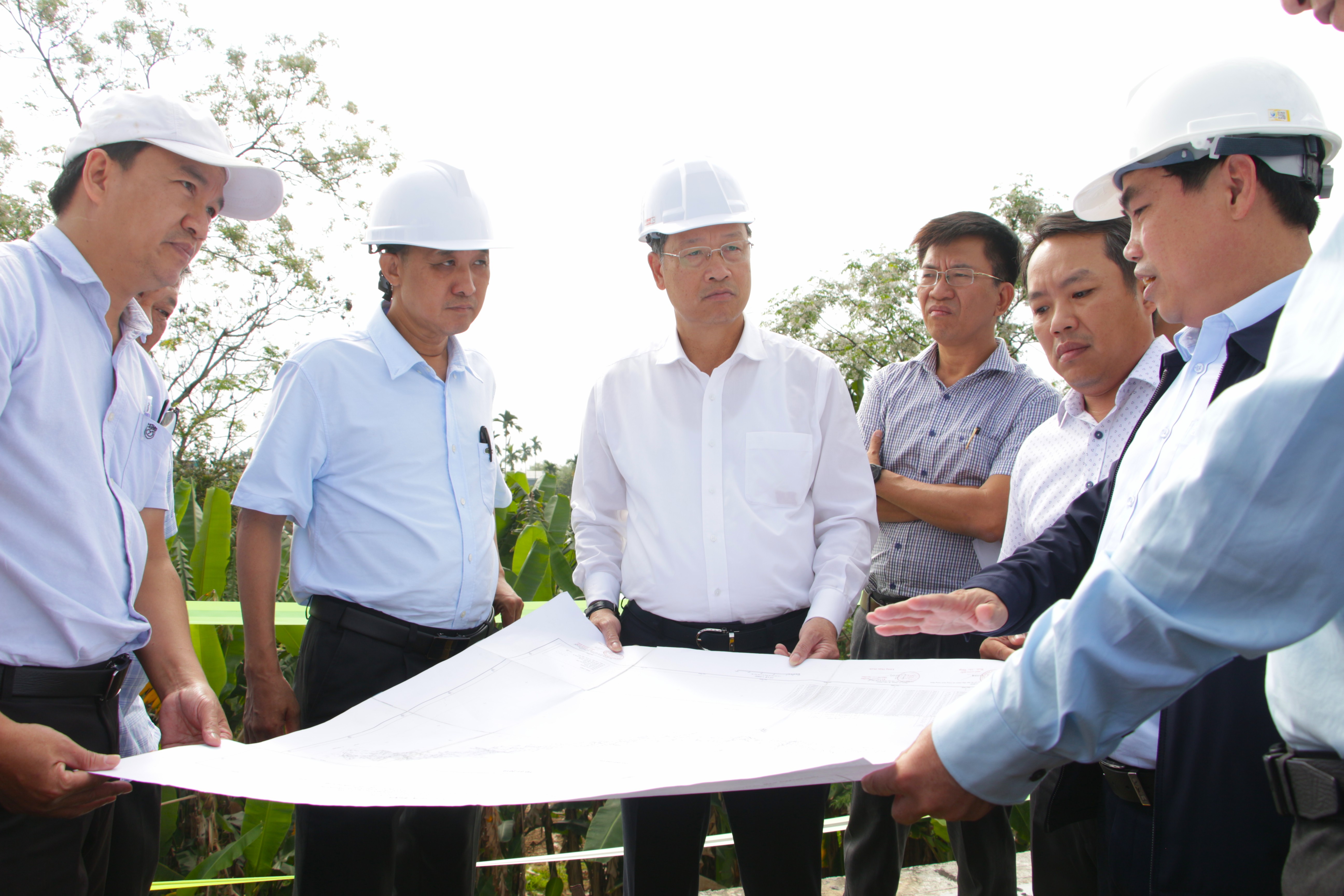 Tại các điểm kiểm tra, Phó Bí thư Thành ủy nghe báo cáo tiến độ thi công, tình hình giải phóng mặt bằng và những khó khăn, vướng mắc ảnh hưởng đến việc triển khai đường dẫn.