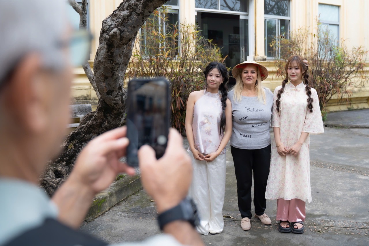 Du khách nước ngoài thích thú chụp ảnh cùng các bạn trẻ mặc áo dài