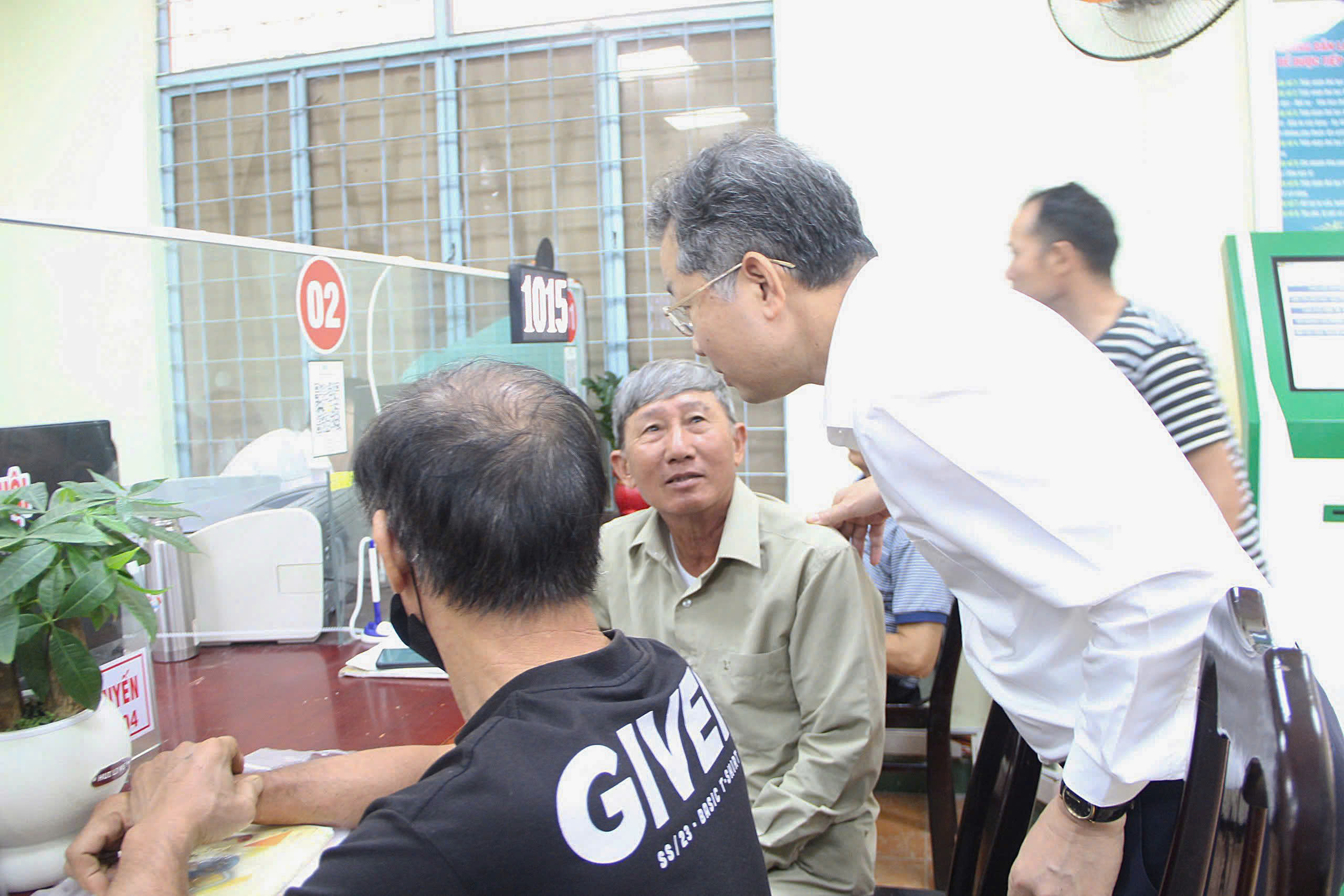 Bí thư Thành ủy hỏi thăm người dân đến làm thủ tục hành chính, đồng thời cho biết mô hình chính quyền 2 cấp mới đi vào hoạt động chắc chắn còn nhiều thiếu sót, vì vậy mong muốn người dân chia sẻ và ủng hộ.