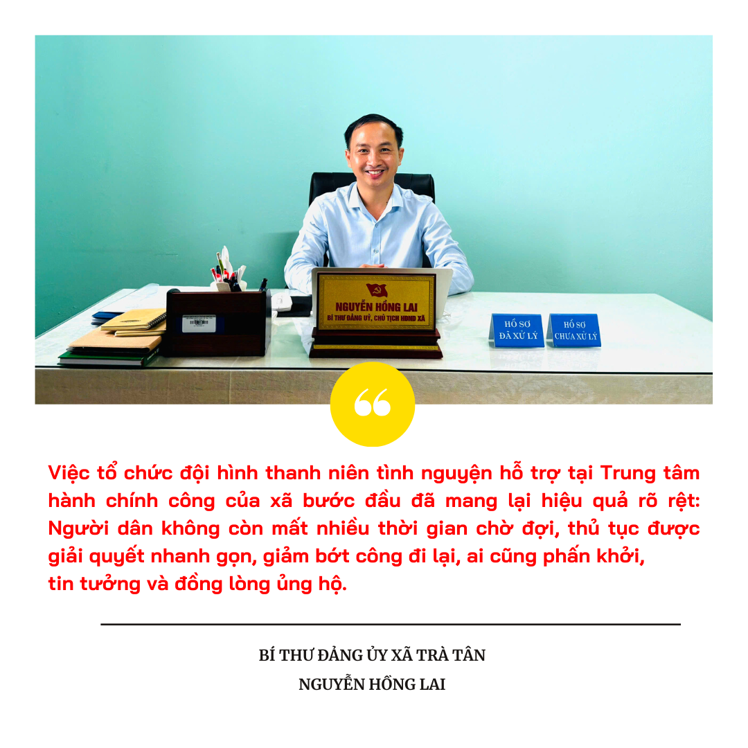 Bí thư Đảng ủy xã Trà Tân Nguyễn Hồng Lai cho biết, nhằm tạo điều kiện thuận lợi cho người dân tiếp cận các dịch vụ công sau sáp nhập, Ban Chấp hành Đoàn xã đã khẩn trương triển khai Kế hoạch tổ chức đội hình thanh niên tình nguyện hỗ trợ tại Trung tâm hành chính công của xã. Kế hoạch được triển khai đồng loạt đến các chi đoàn, đoàn viên, thanh niên và chính thức ra quân vào ngày 7/7/2025.